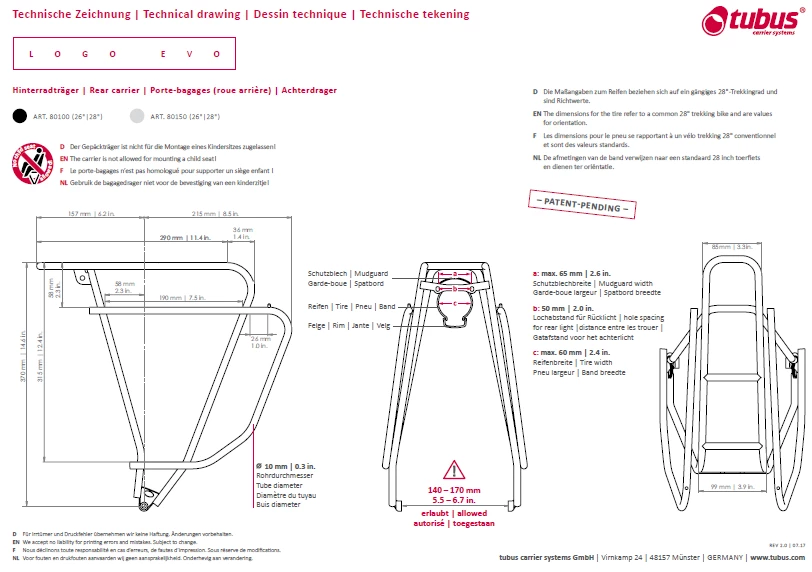 - L’écartement autorisé des pieds du porte-bagage (dimension interne) doit être comprise entre 140 et 170 mm. Ne convient donc pas à des cadres dont l’écartement des bases arrières est inférieur à 140mm ou supérieur à 170mm.